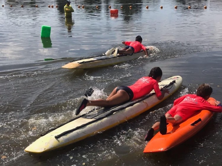 Les sauveteurs partent de la plage, avec leur planche de sauvetage et doivent effectuer un parcours autour de bouées arrimées et terminer leur parcours en courant sur la plage pour passer la ligne d’arrivée.